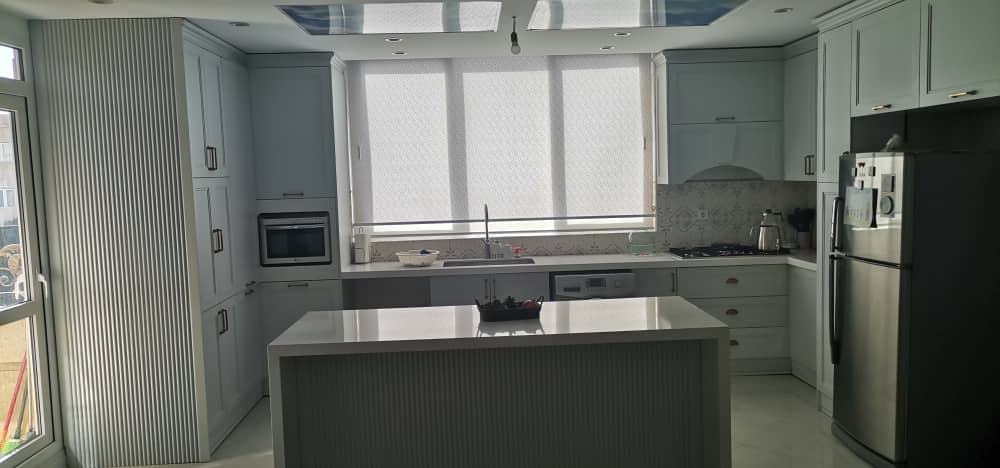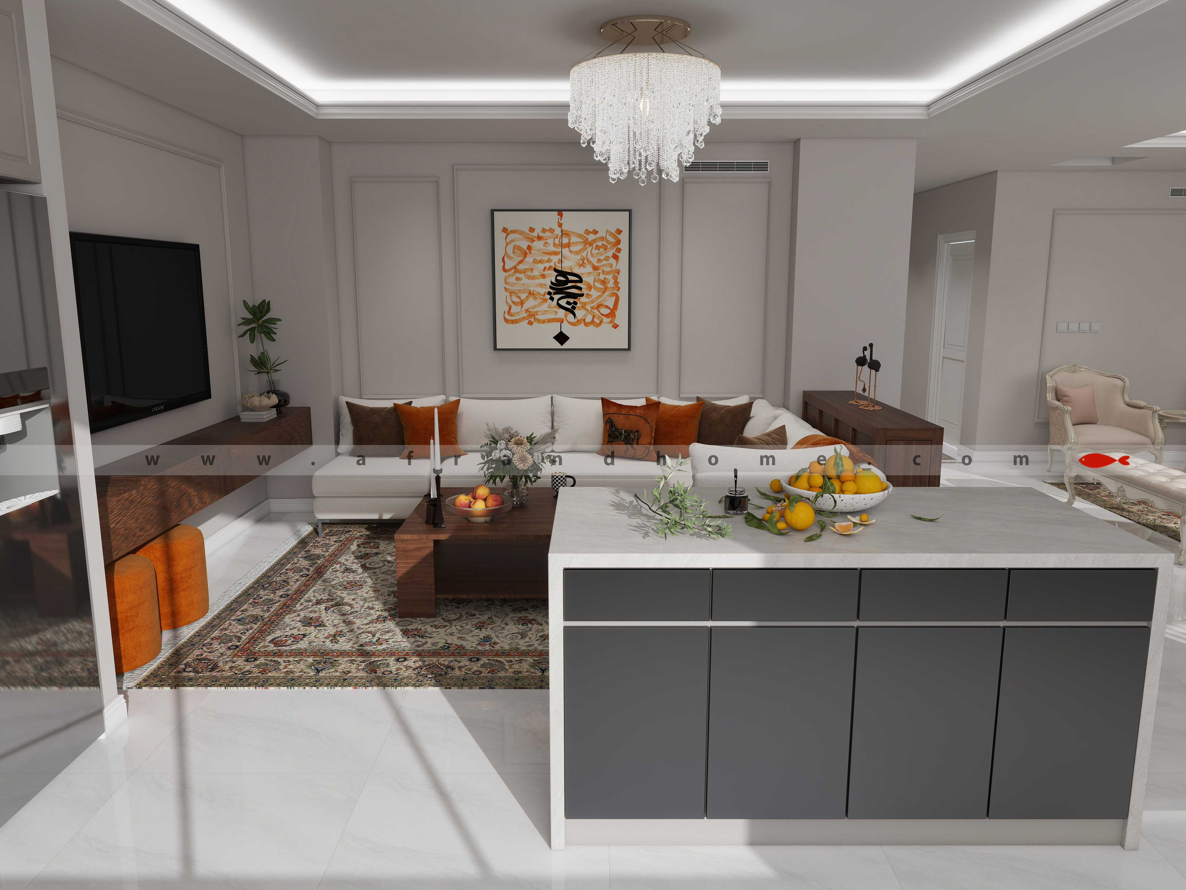 با توجه به سبک زندگی خانواده و تعداد کم مهمان‌ها، میز غذاخوری از طراحی حذف شد. جزیره‌ی آشپزخانه به عنوان میز ناهارخوری روزمره در نظر گرفته شد تا فضا بازتر و یکدست‌تر باشه. در عین حال، از ما خواسته شد که چیدمان مبلمان طوری طراحی بشه که در زمان حضور مهمان، بتونید  مبل‌ها را به‌راحتی جابه‌جا کنید و فضای کافی برای پهن کردن سفره داشته باشید.