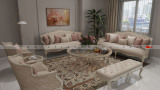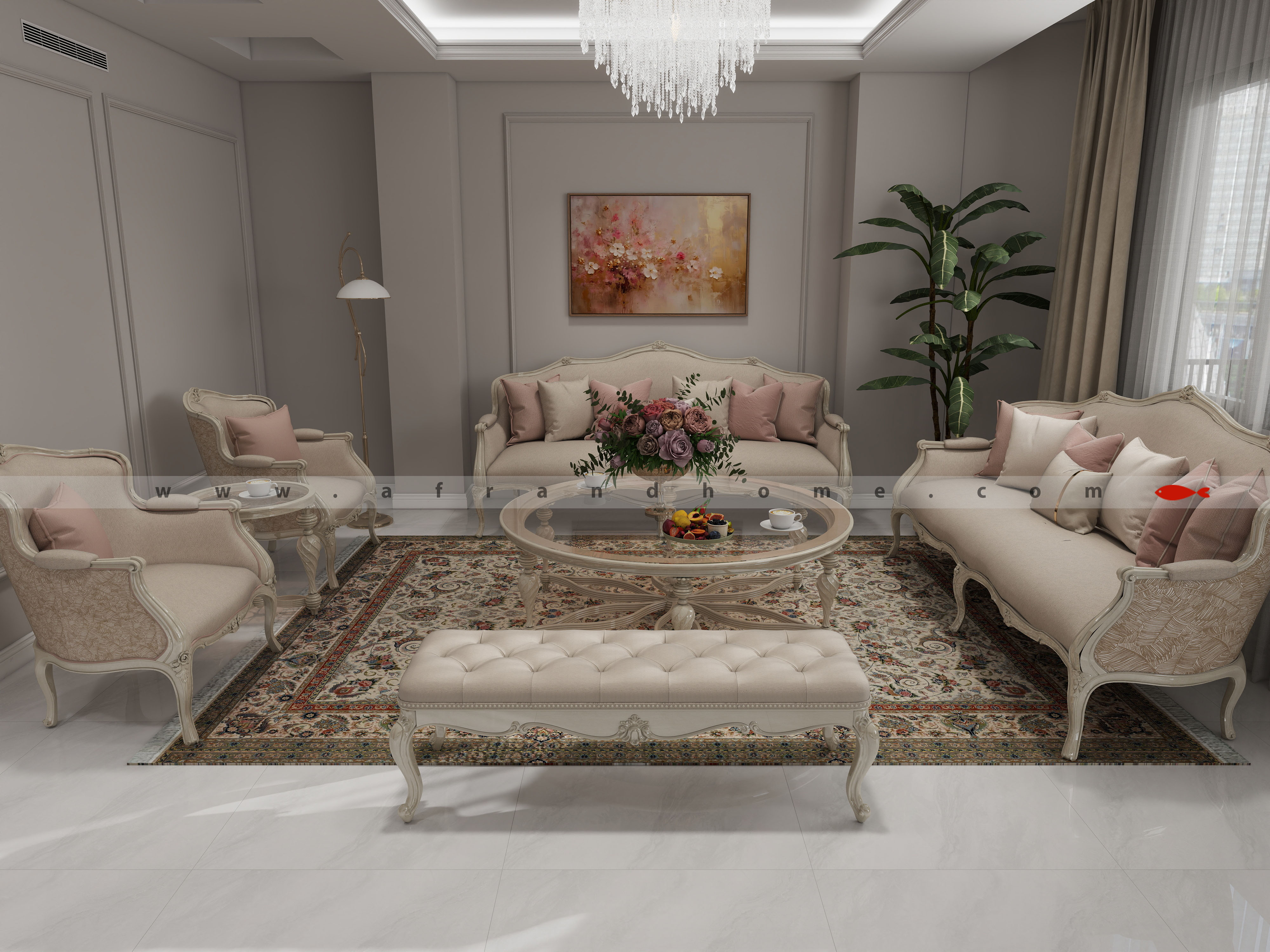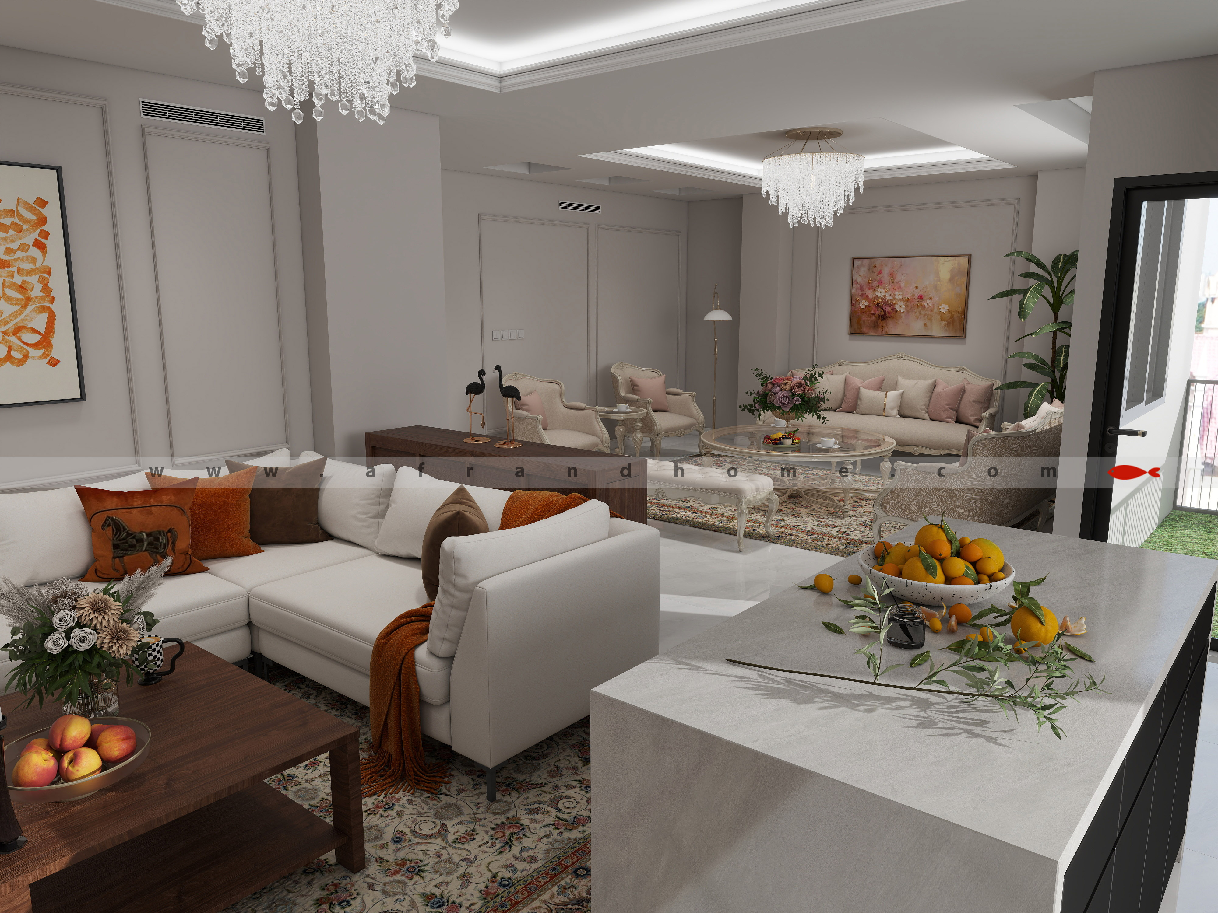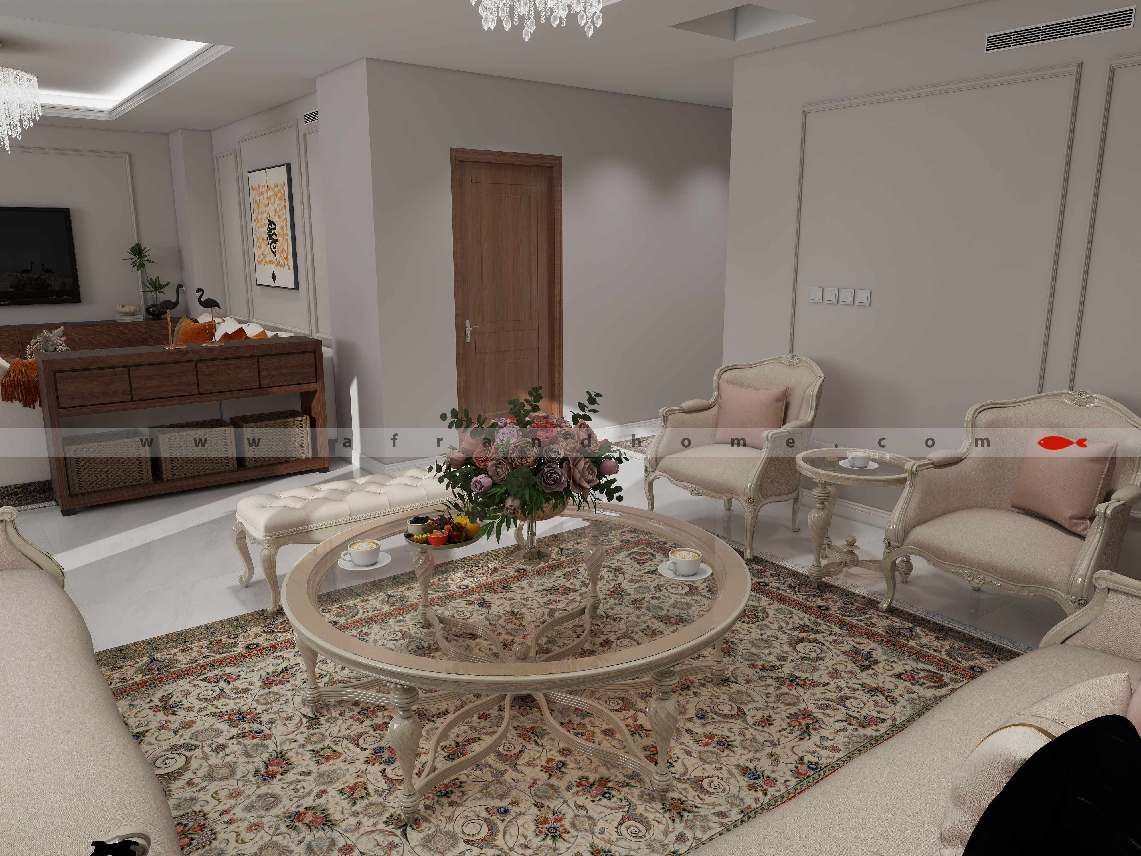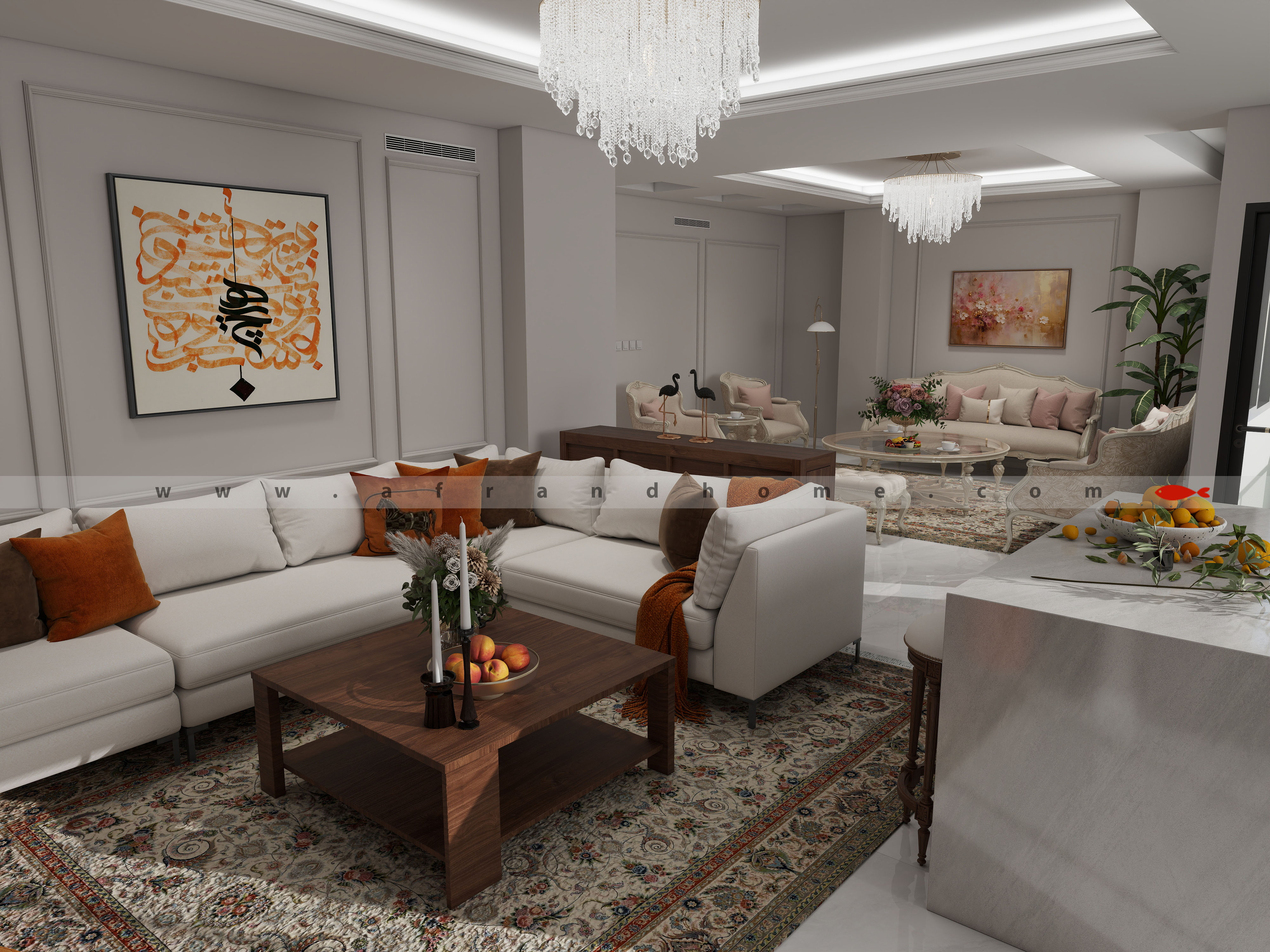 ترکیب انتخابی شما شامل یک ست مبل نئوکلاسیک و یک مبل ال بود تا هم جلوه‌ای مجلل به فضا بده و هم برای استفاده روزمره، راحت و کارآمد باشه. محل تلویزیون از قبل تعبیه شده بود و امکان تغییر جانمایی وجود نداشت، بنابراین طراحی مبلمان و چیدمان باید دقیقاً با همون موقعیت هماهنگ می‌شد.